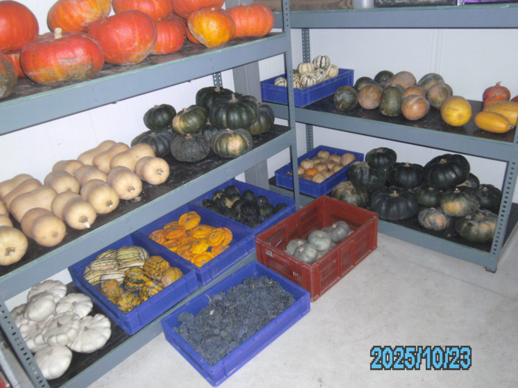 Photo du magasin le 23 octobre 2025 : raisins et différentes cucurbitacées (potirons, potimarrons, butternuts, courges spaghetti, pâtissons blancs et oranges, musquées de Provence…).